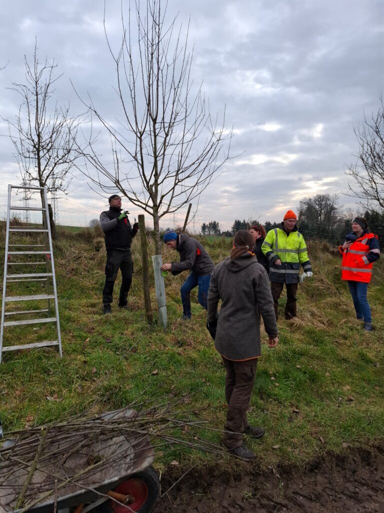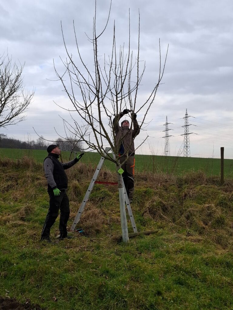 Nach einer kurzen theoretischen Einführung stand vor allem die praktische Arbeit im Mittelpunkt. Geübt wurde direkt an Hochstamm-Apfelbäumen, die der Holter Kultobst e. V. vor rund drei Jahren gepflanzt hatte. An diesen noch jungen Bäumen ließ sich anschaulich zeigen, wie durch einen fachgerechten Erziehungsschnitt stabile Kronen aufgebaut und die Grundlage für gesunde, langlebige aber auch ertragreiche Obstbäume geschaffen werden kann.